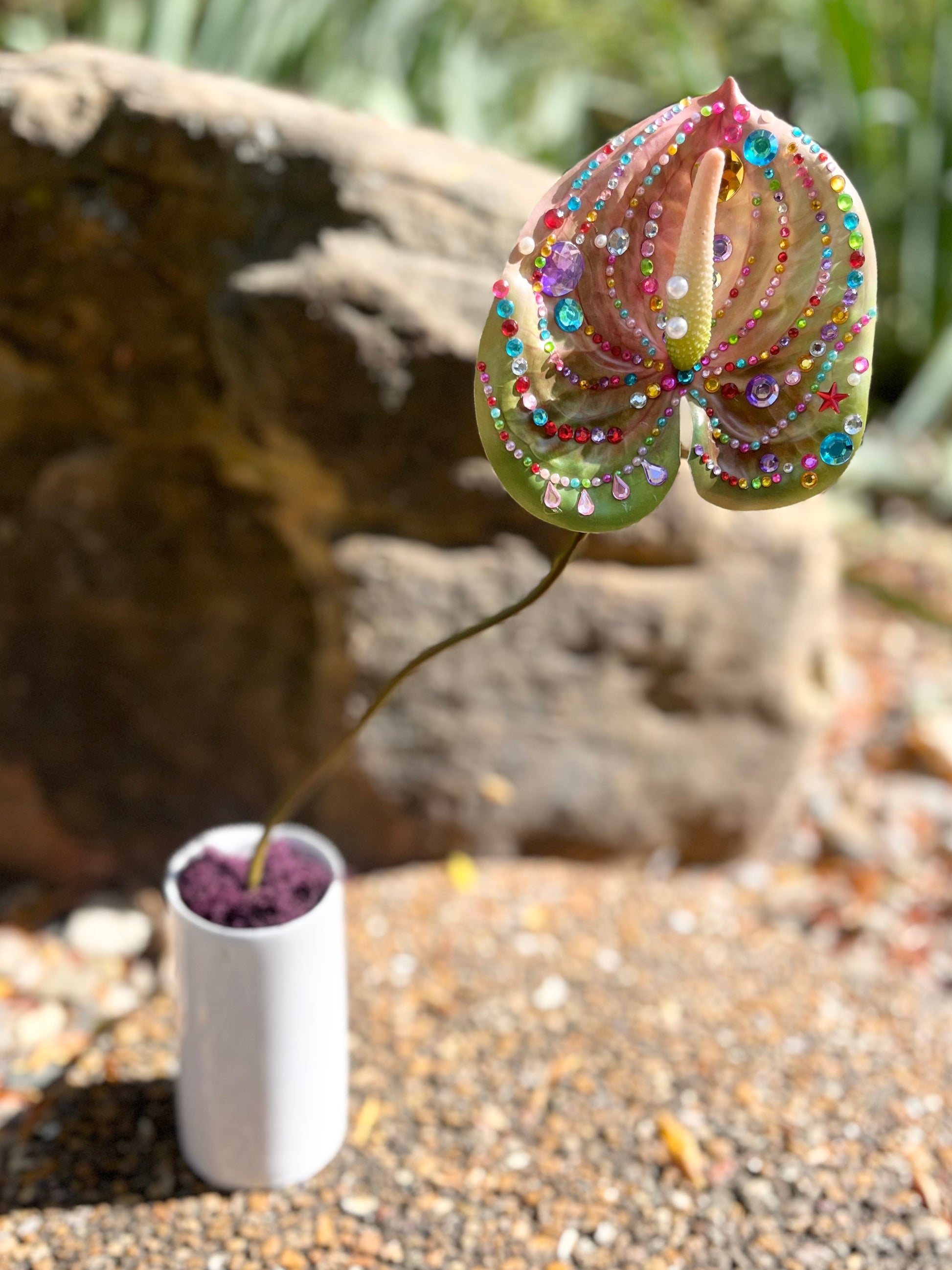A fierce forever flower. Silk anthurium, bedazzled and pierced with a pearl pin. In a white vase with moss.