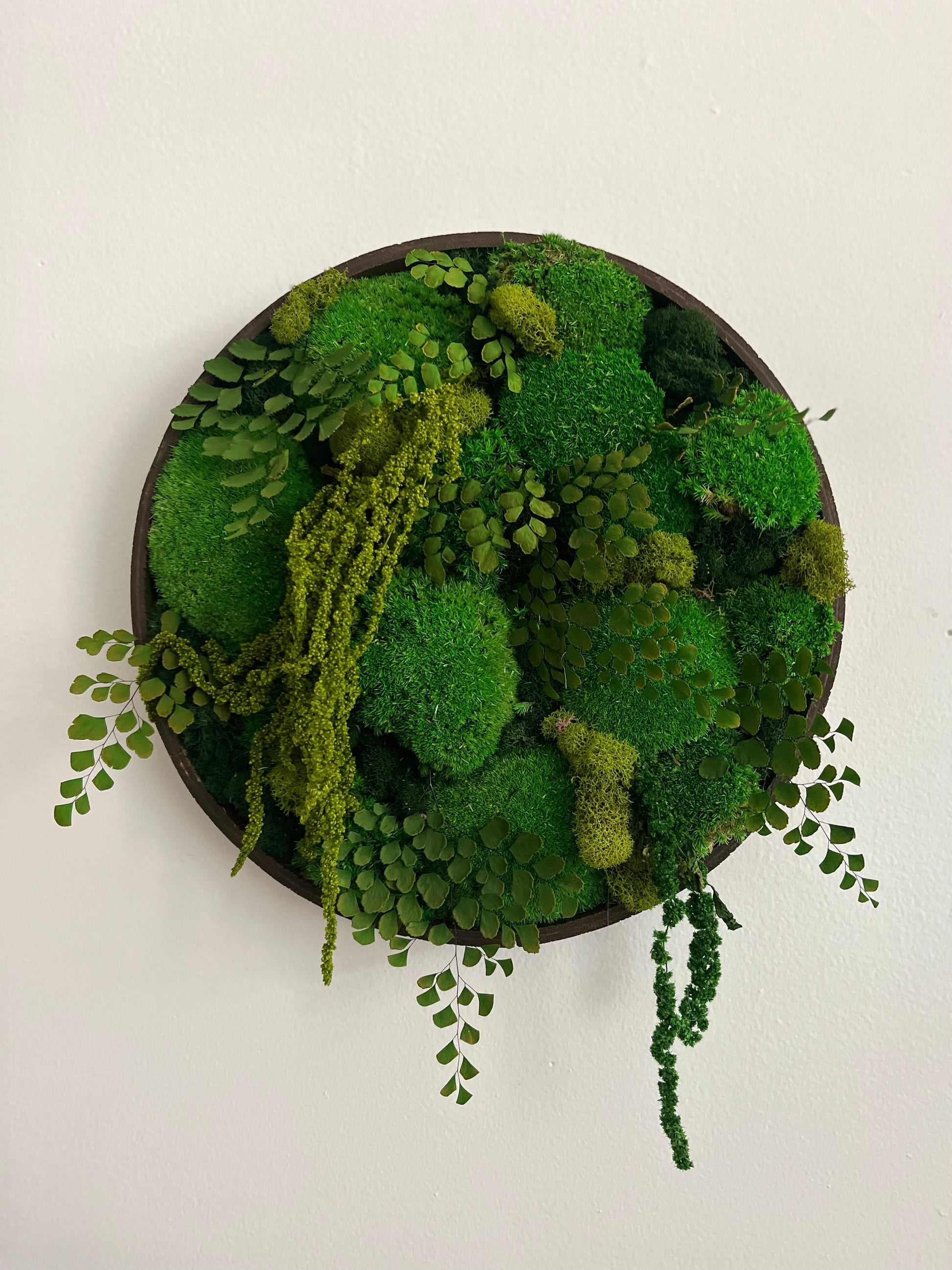 Moss Art in 14” circle frame. Dark stained wood. Fern accents. With draping amaranth.