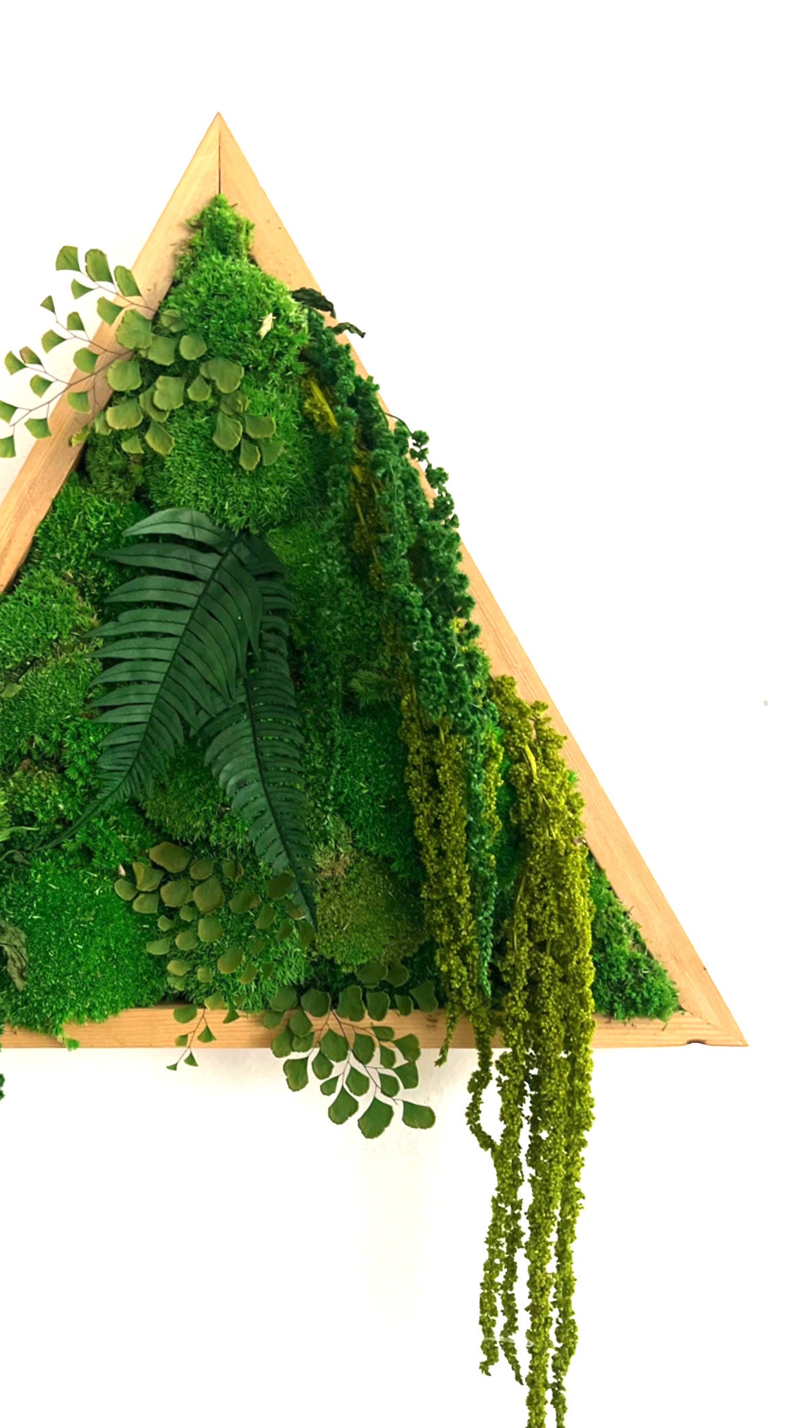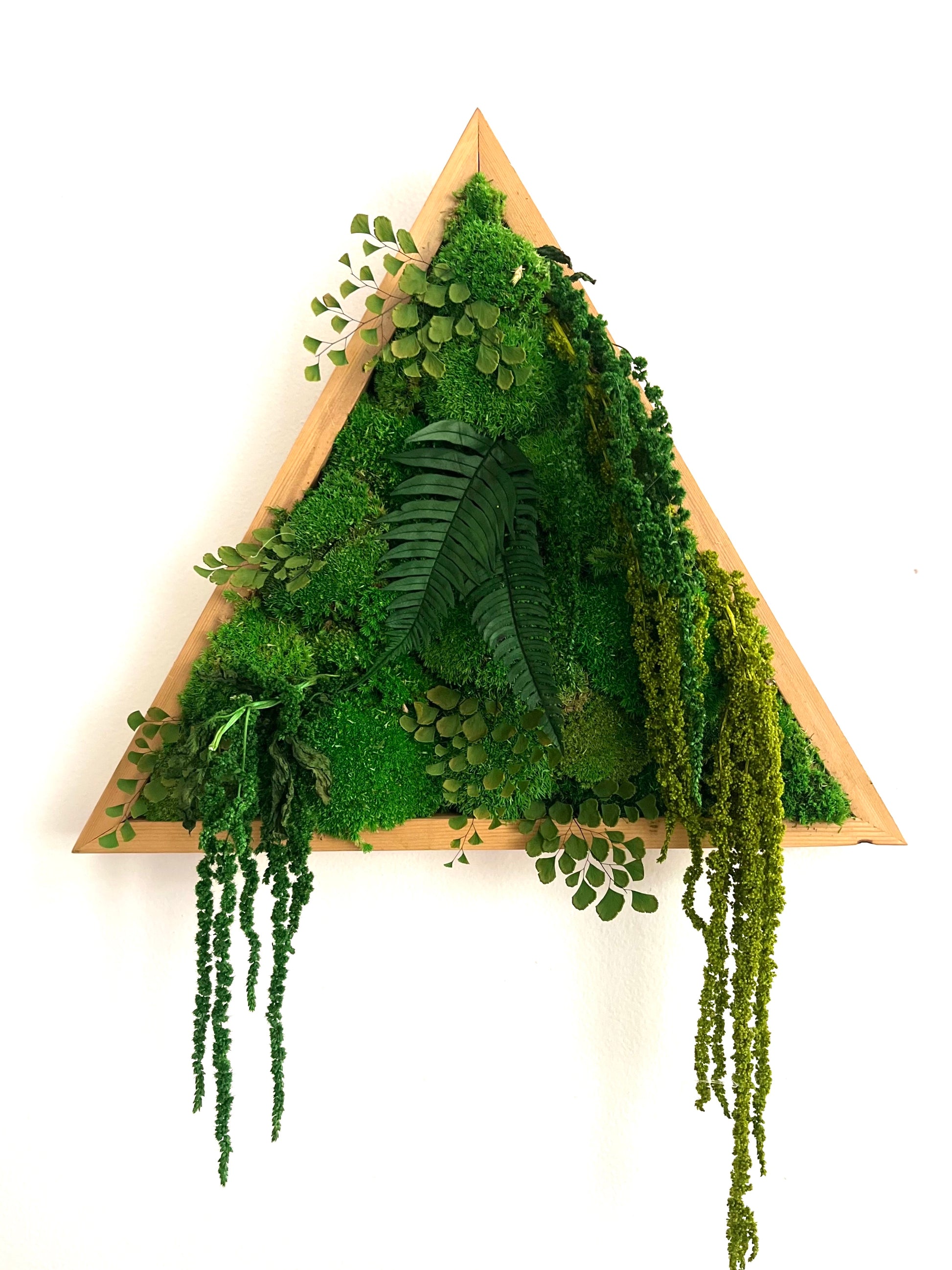 Moss Art in 18” triangle frame. Light wood. Fern accents. With draping amaranth.