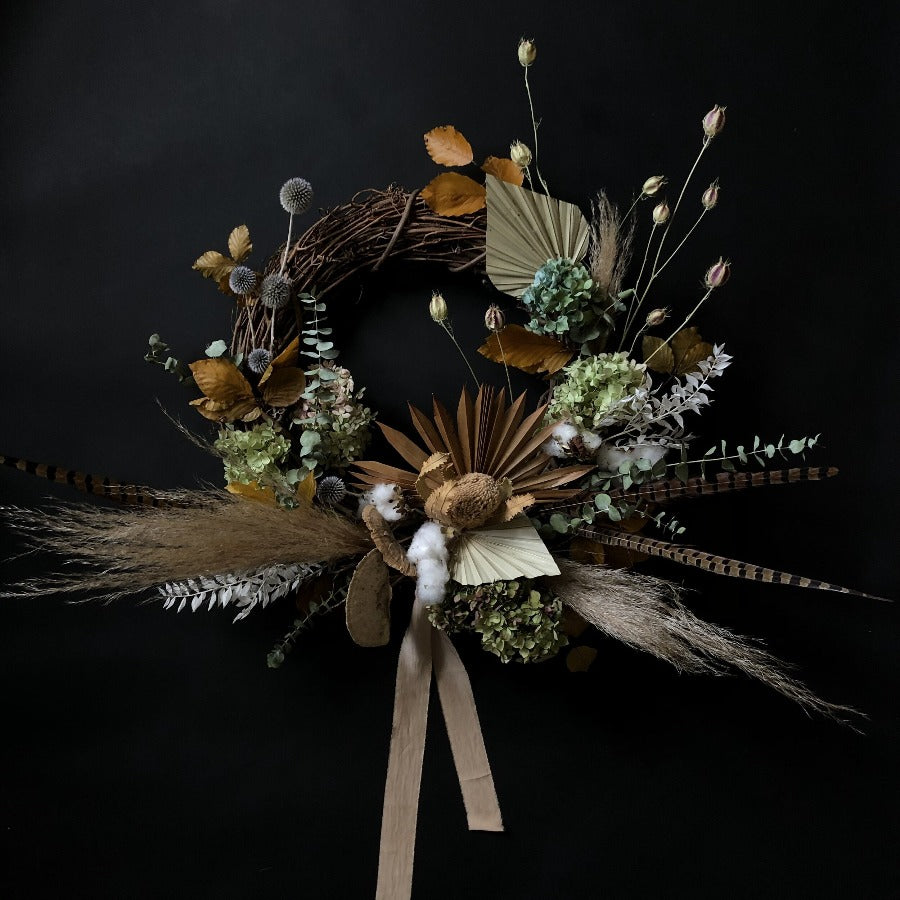 Grapevine wreath form featuring a whimsical display of natural and preserved elements. Accented by a trailing silk ribbon.
